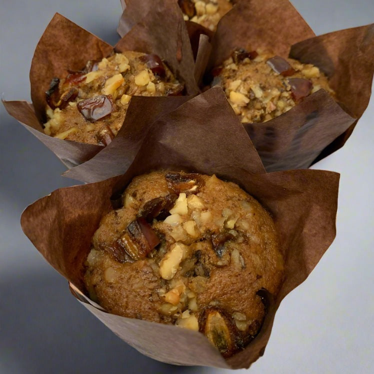 Karamele's Dates & Walnut Muffins are a nutritious delight, made with Sorghum flour (100% millet), ensuring they are gluten-free and rich in essential nutrients. These Plant Based muffins are sweetened with jaggery, providing a natural, unrefined sweetness packed with minerals. Dates offer natural sweetness, fibre, and essential vitamins, while walnuts add healthy fats, protein, and antioxidants. Free from preservatives, refined sugar, and artificial Flavors, these muffins are a wholesome and delicious snack choice.