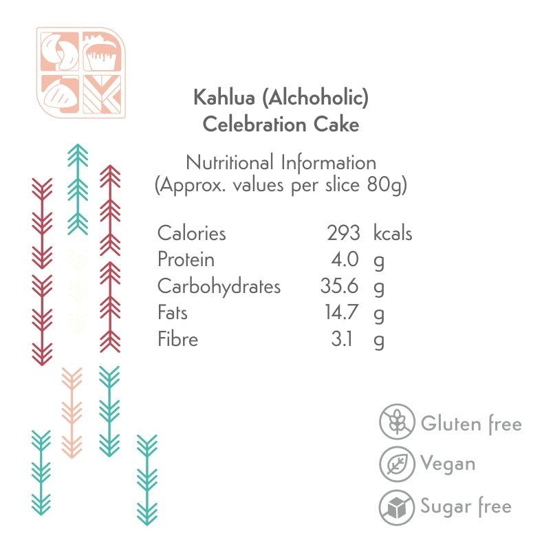 Sorghum flour, quinoa flour, Organic jaggery, Rice bran oil, Unsweetened cocoa powder, Soy Based whipping cream, Plant Based Callebaut chocolate, Rum, Kahlua Liqueur, Coffee powder.