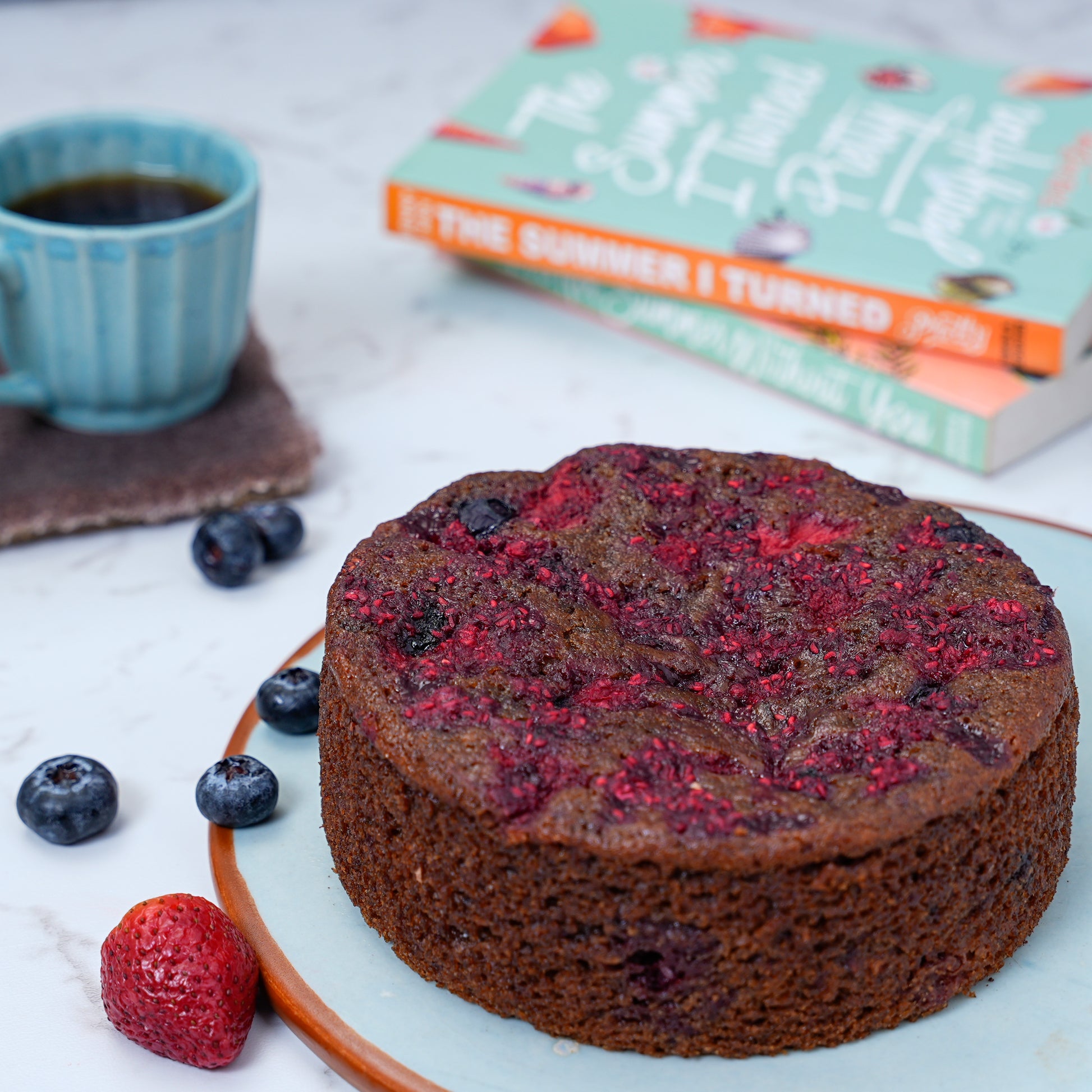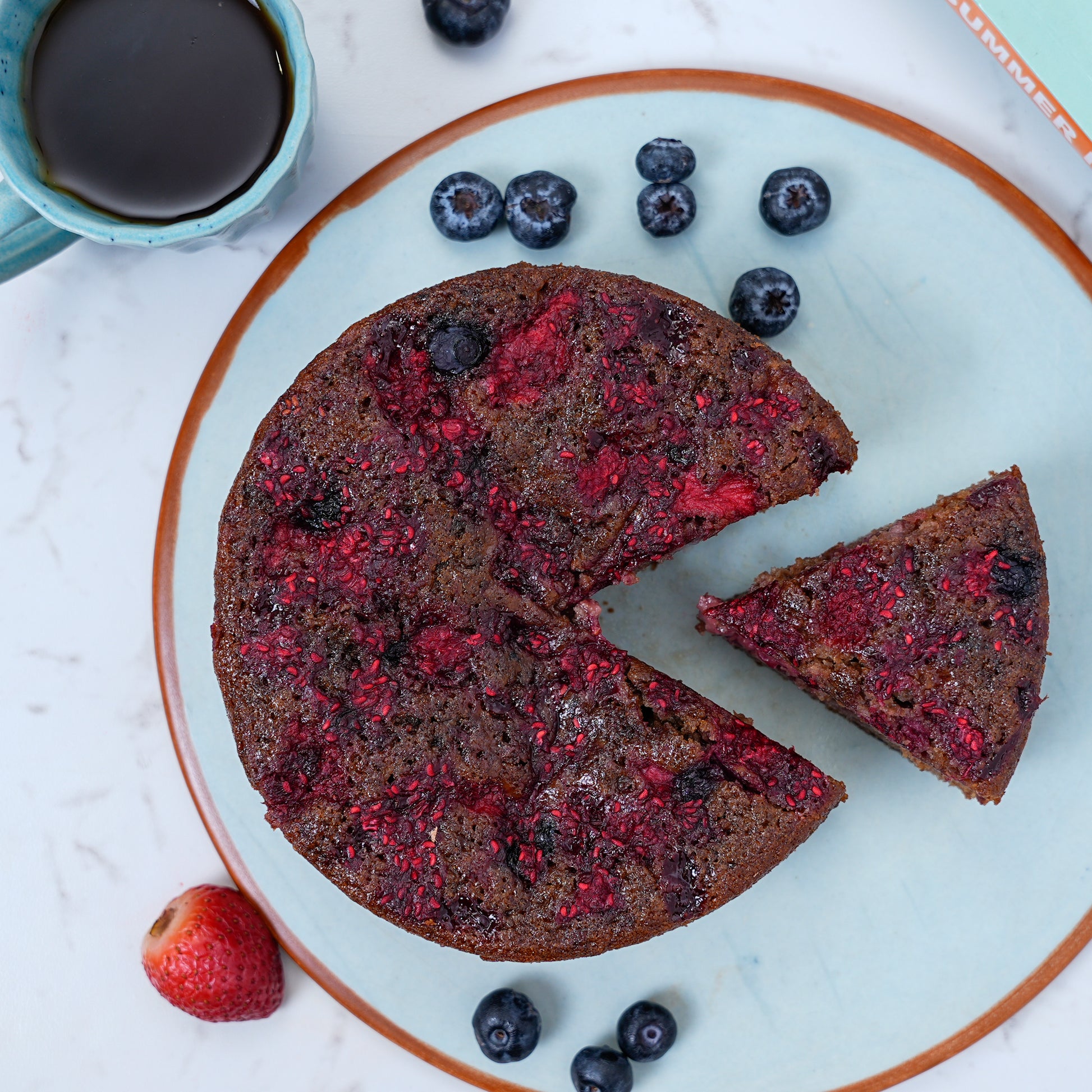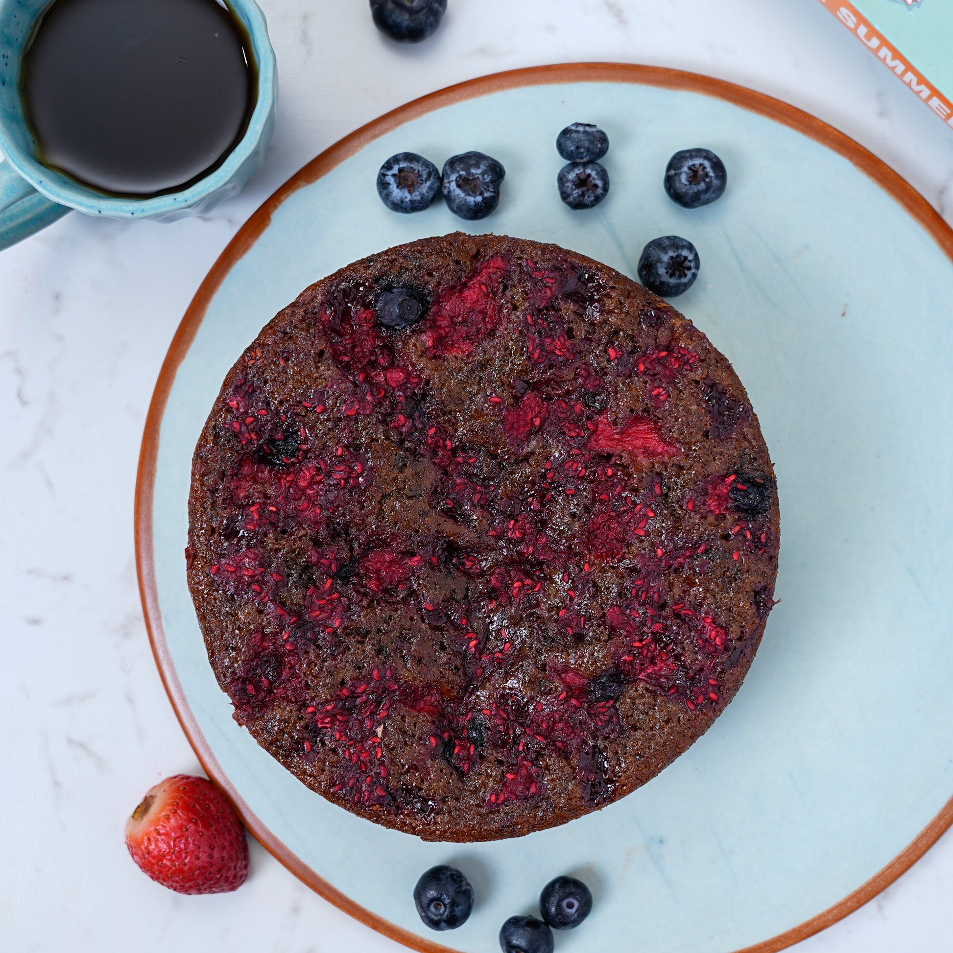 Baked with Karamele's premium sorghum flour, this gluten-free and vegan cake is naturally sweetened with organic jaggery, making it a wholesome alternative to conventional desserts. The rich flavours of frozen blueberries and strawberries come alive in every bite, enhanced by our in-house strawberry and blueberry preserves. A touch of fresh lemon zest adds a bright citrusy note that perfectly balances the sweetness of the berries. Combined with rice bran oil, this cake boasts a moist, tender crumb that's as nourishing as it is delicious.